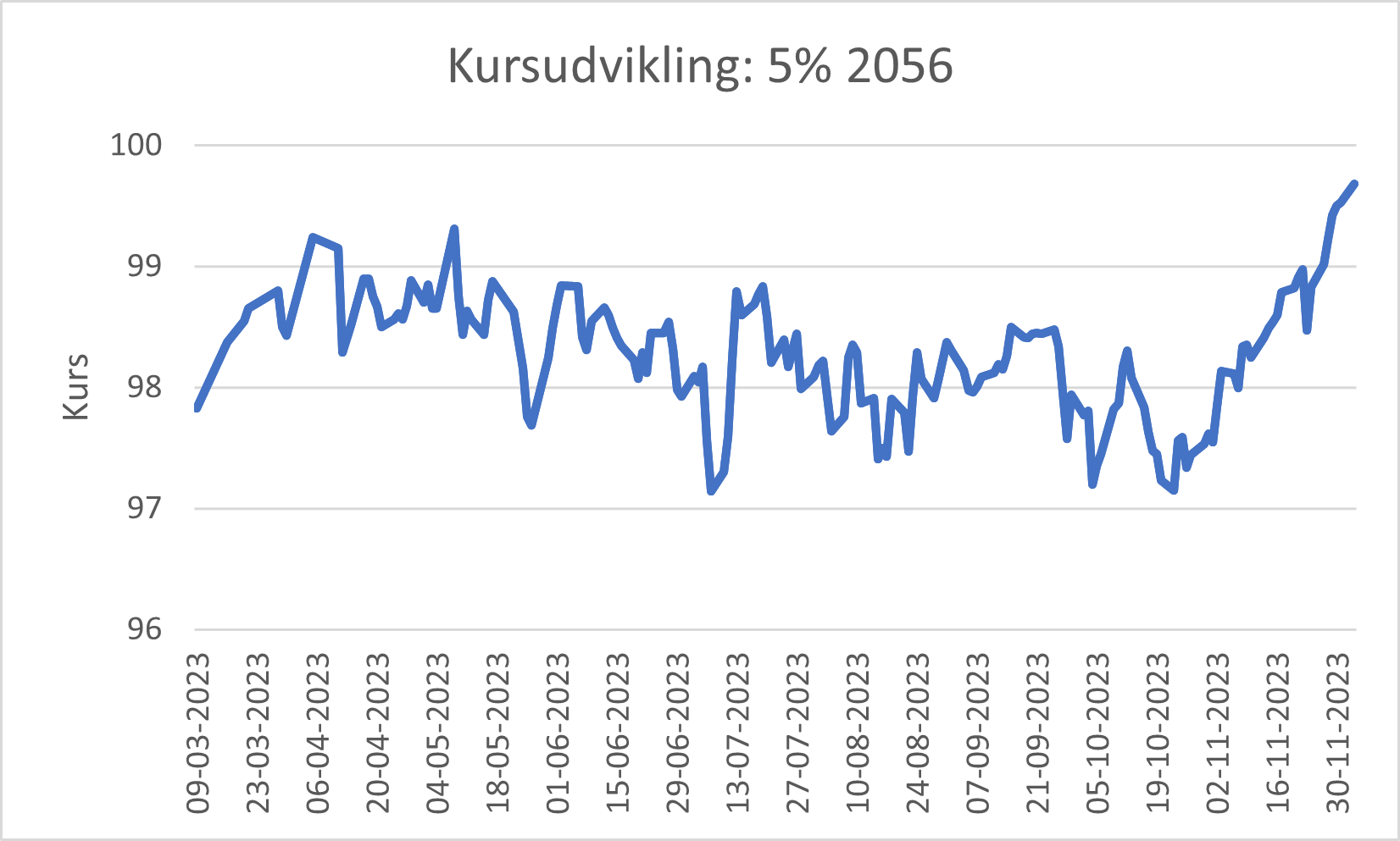 Fra marts til oktober 2023 har den lange realkreditrente været stort set uændret på godt 5 %. I løbet af november er kurserne dog steget pænt, så vi nu ser 5 %-lånet nærme sig kurs 100. Men renten er ikke meget lavere nu, end den var i starten af året.