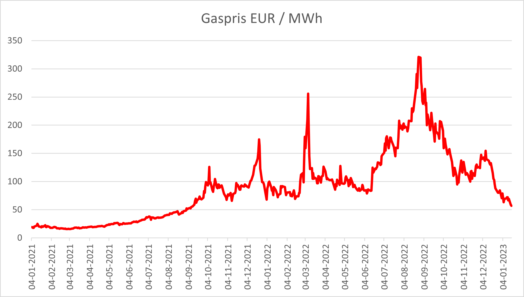 Siden slutningen af august 2022 har gaspriserne dog været faldende. Og det i en sådan grad, at gaspriserne nu er lavere end før krigen i Ukraine. Fokus på at sænke forbruget især i den kolde tid, at vi har kunne klare os med 20 grader hjemme i stuen i stedet for 21 grader, har virket, og det har haft en meget markant indvirkning på priserne.