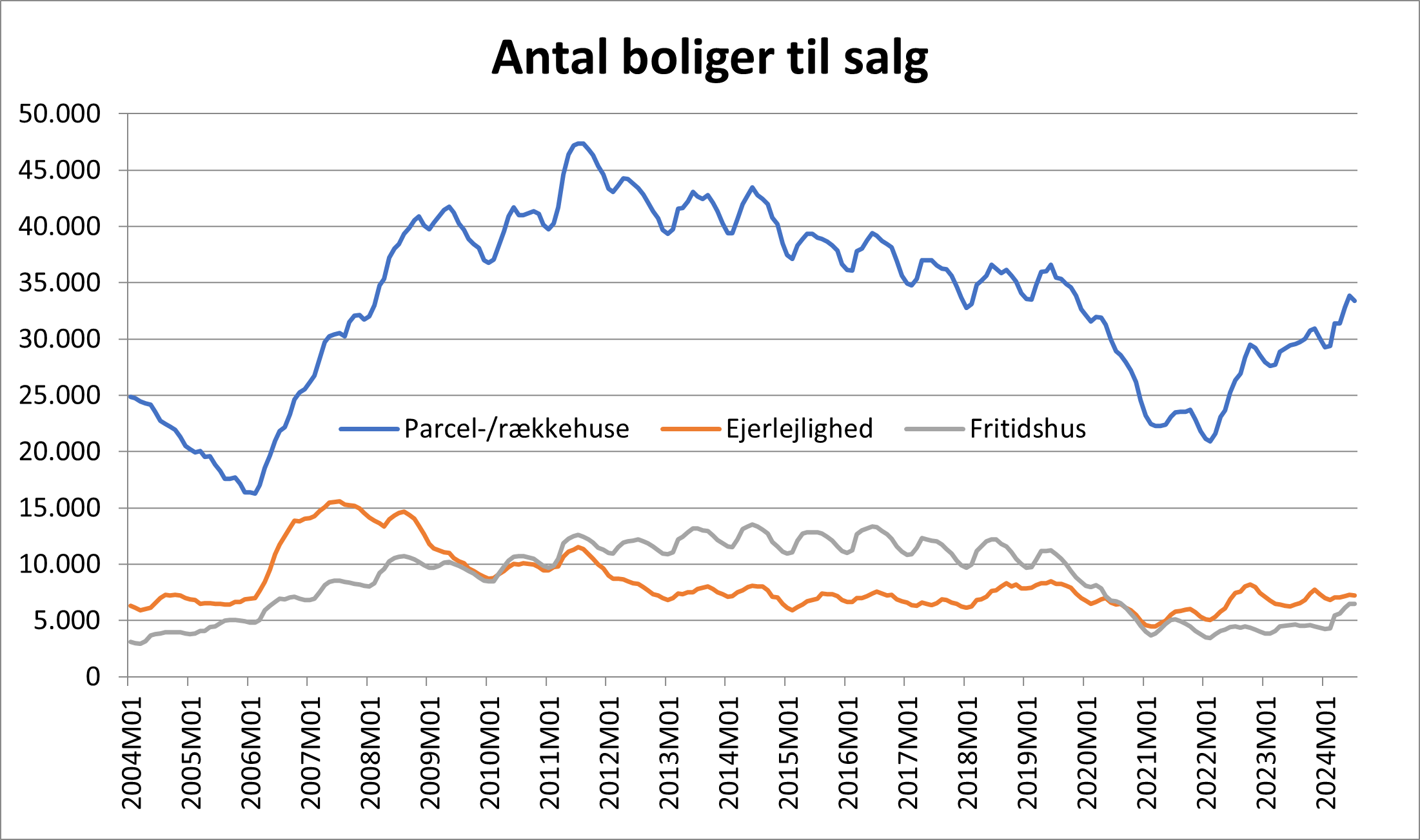 Antallet af boliger til salg stiger. Der er 60 % flere boliger til salg nu end for godt 2 år siden. Niveauet er ved at være tilbage på normalen før corona-tiden. Over 33.000 huse var til salg i juli 2024. Det er det højeste antal siden corona for alvor ramte Danmark i marts 2020. De højere renter er ved at sætte sit præg på boligmarkedet.