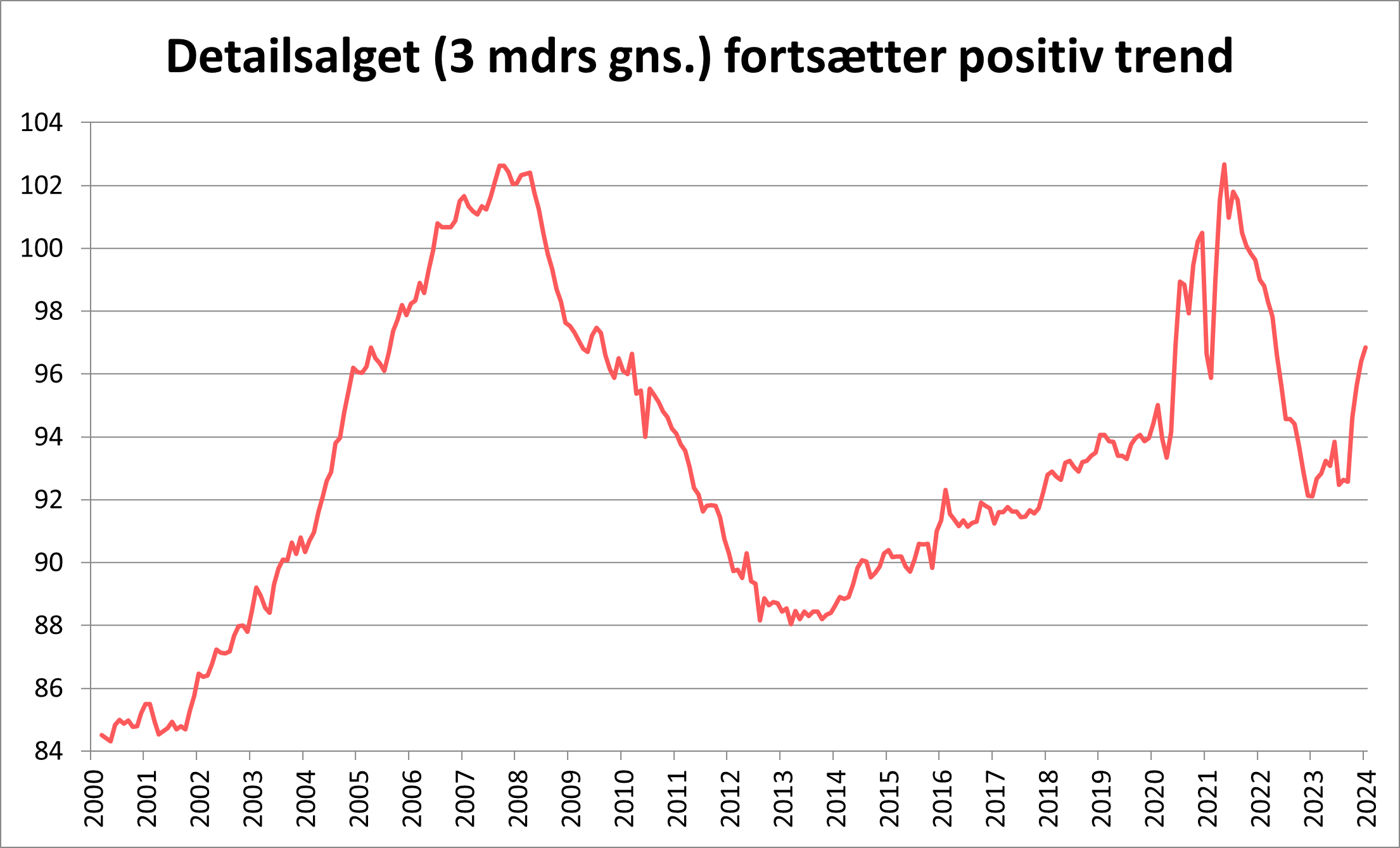 Detailsalget i januar bød på en lille stigning på 0,4 % i forhold til december måned. Det fortsætter den igangværende tendens med et stigende detailsalg, som vi har set det sidste års tid. Stigningen er på hele 4,9 % i forhold til januar 2023. De høje niveauer fra corona-tiden er vi endnu ikke i nærheden af, men vi begynder at nærme os. Tallene indikerer samtidig, at de store fald ligger bag os, og at reallønsstigningerne begynder at kunne ses i detailsalget.