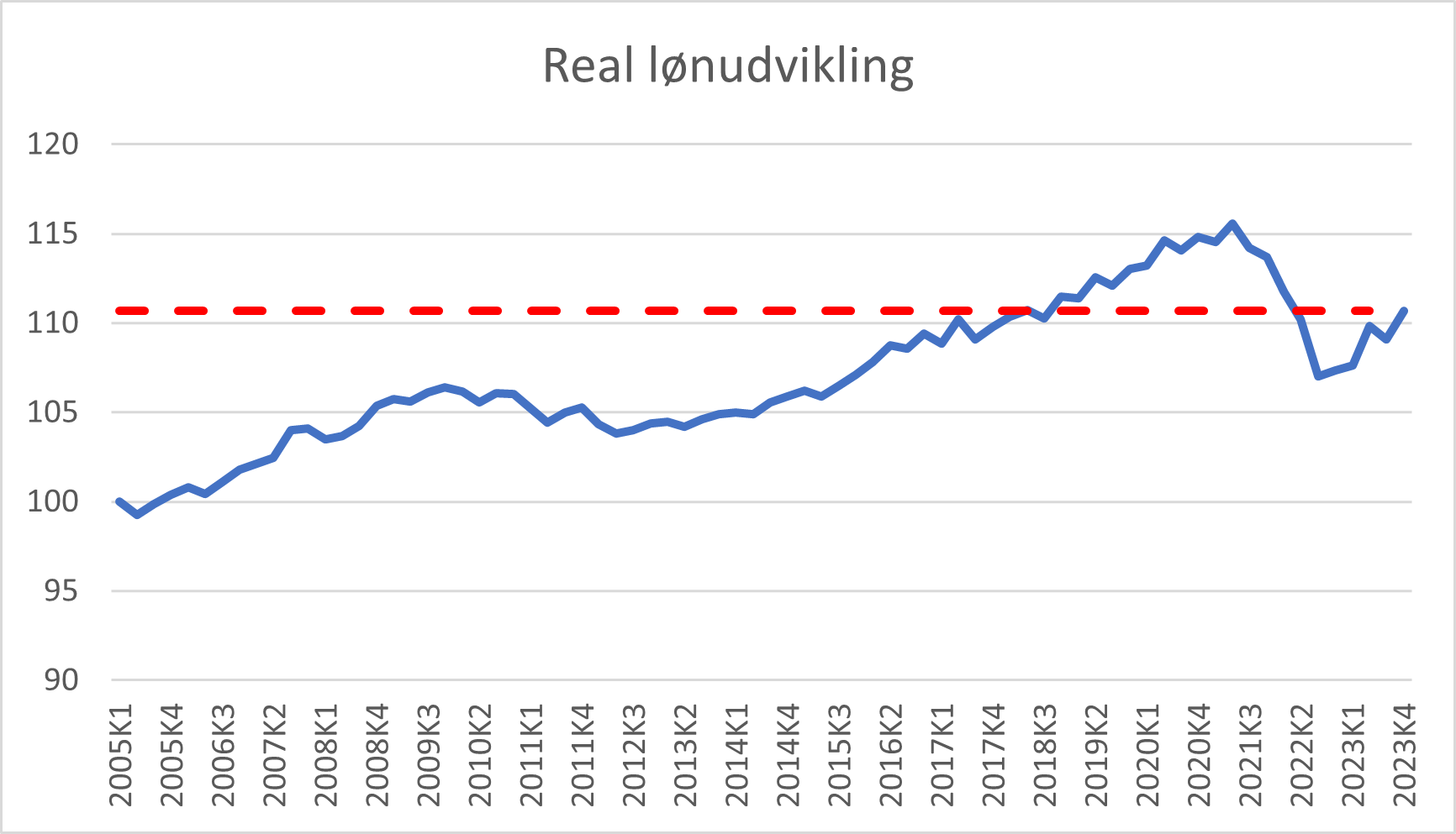 De gennemsnitlige lønninger i dansk økonomi steg med 3,6 % i 4. kvartal 2023 i forhold til samme kvartal året før. Inflationen er aftaget så meget, at reallønnen igen er stigende. Men reallønnen er alligevel godt 4 % lavere end i starten af 2021. Købekraften er på niveau med 2018.