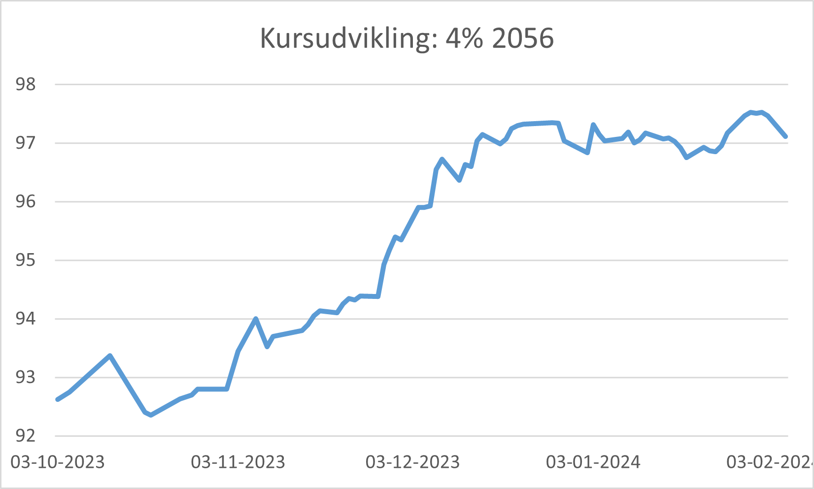 Udstedelserne sker pt. i 4 % 2056-serien. De lange realkreditrenter faldt pænt i november og december, men ligger nu igen stabilt. Vi mener fortsat, at de lange renter vil forblive på det nuværende niveau, mens kerneinflationen falder yderligere tilbage mod 2 %. Der kan dog komme udsving undervejs. Markedet forventer rentesænkninger fra 2. kvartal 2024.