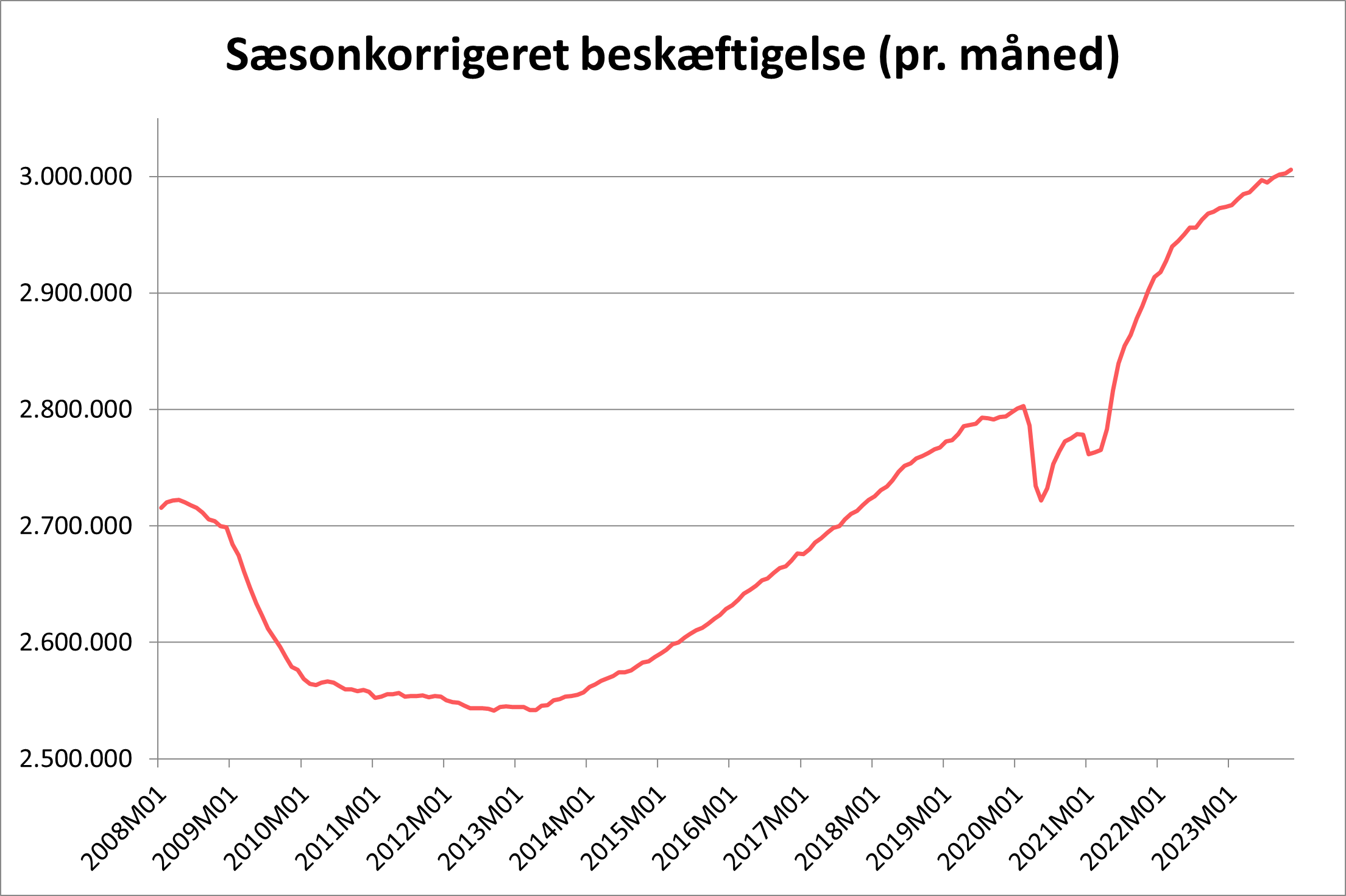Beskæftigelsen er nu – bortset fra en enkelt måned med et mindre fald - steget 34 måneder i træk. Det vil sige lige siden den sidste corona-nedlukning i januar 2021, hvilket er ganske imponerende. Beskæftigelsen trodser således fortsat udviklingen i resten af økonomien. Og vi må sande, at den såkaldte ”inflationskrise” med kraftige rentestigninger til følge slet ikke har haft den forventede indvirkning på beskæftigelsen.