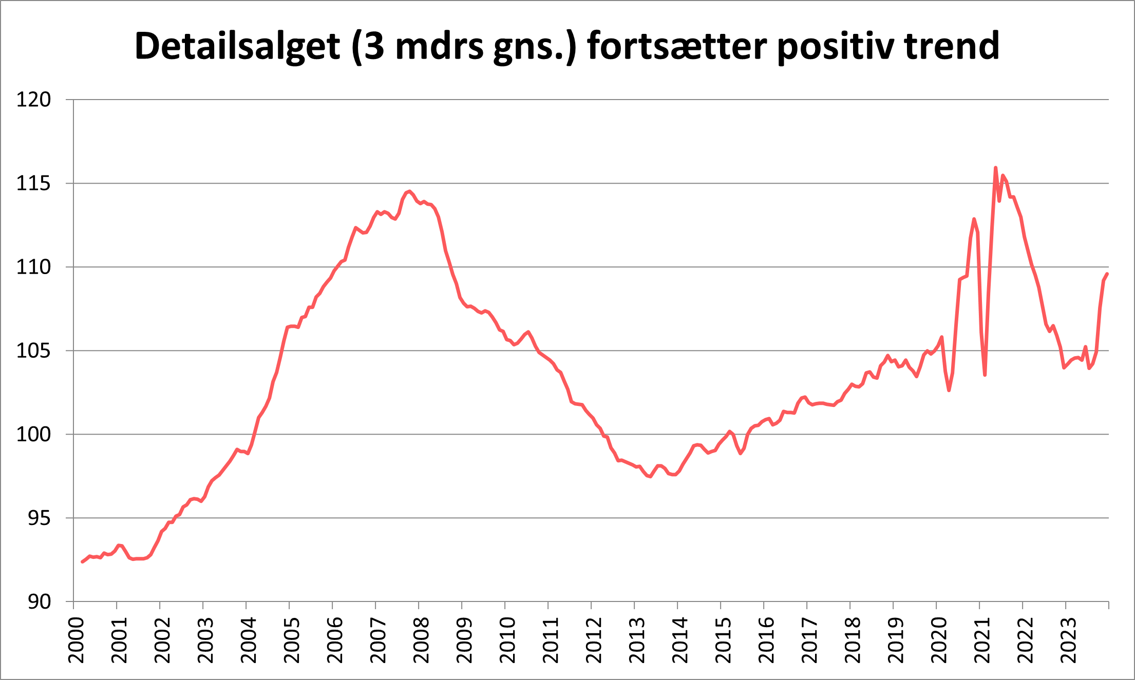 Detailsalget i december måned bød på et lille fald på 1,1 % i forhold til november måned. Det ændrer dog ikke på, at tendensen fortsat er et stigende detailsalg, som vi har set det sidste års tid. Stigningen er på hele 5,9 % i forhold til december 2022, De høje niveauer fra corona-tiden er vi endnu ikke i nærheden af, men vi begynder at nærme os. Tallene indikerer samtidig, at de store fald er overstået, og at reallønsstigningerne begynder at kunne ses i detailsalget.