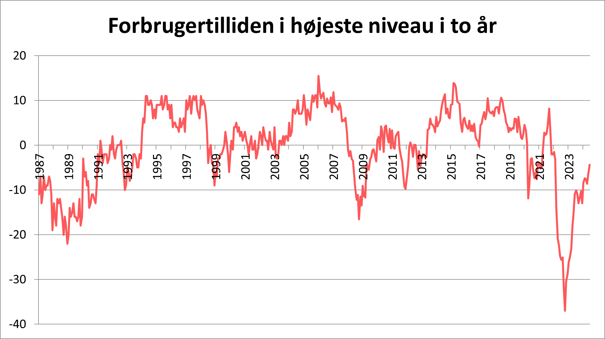 I juni måned blev forbrugertilliden opgjort til -4,4. Der er tale om det højeste niveau siden starten af 2022, og dermed nærmer forbrugertilliden sig også en form for normalisering. Der er tale om endnu en markant bedring efter indikatoren lå stabilt i de første måneder af 2024. Samtidig har forbrugerne endegyldigt lagt de historisk lave niveauer, vi så i efteråret 2022 bag sig.