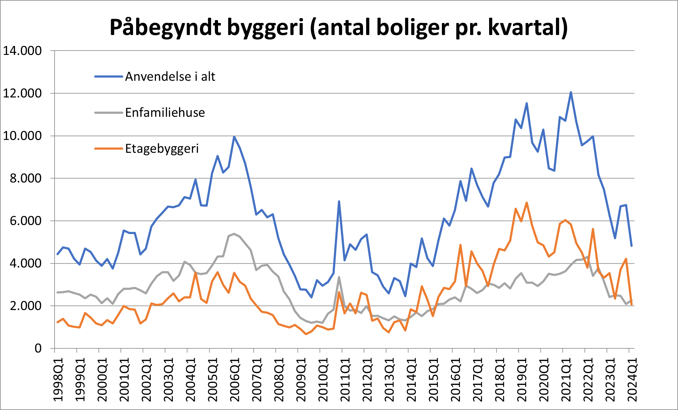 4.822 boliger blev påbegyndt i byggeriet i 1. kvartal 2024. Det er det laveste niveau siden 2015. I 2. kvartal 2021 blev der påbegyndt byggeriet af næsten tre gange så mange boliger.