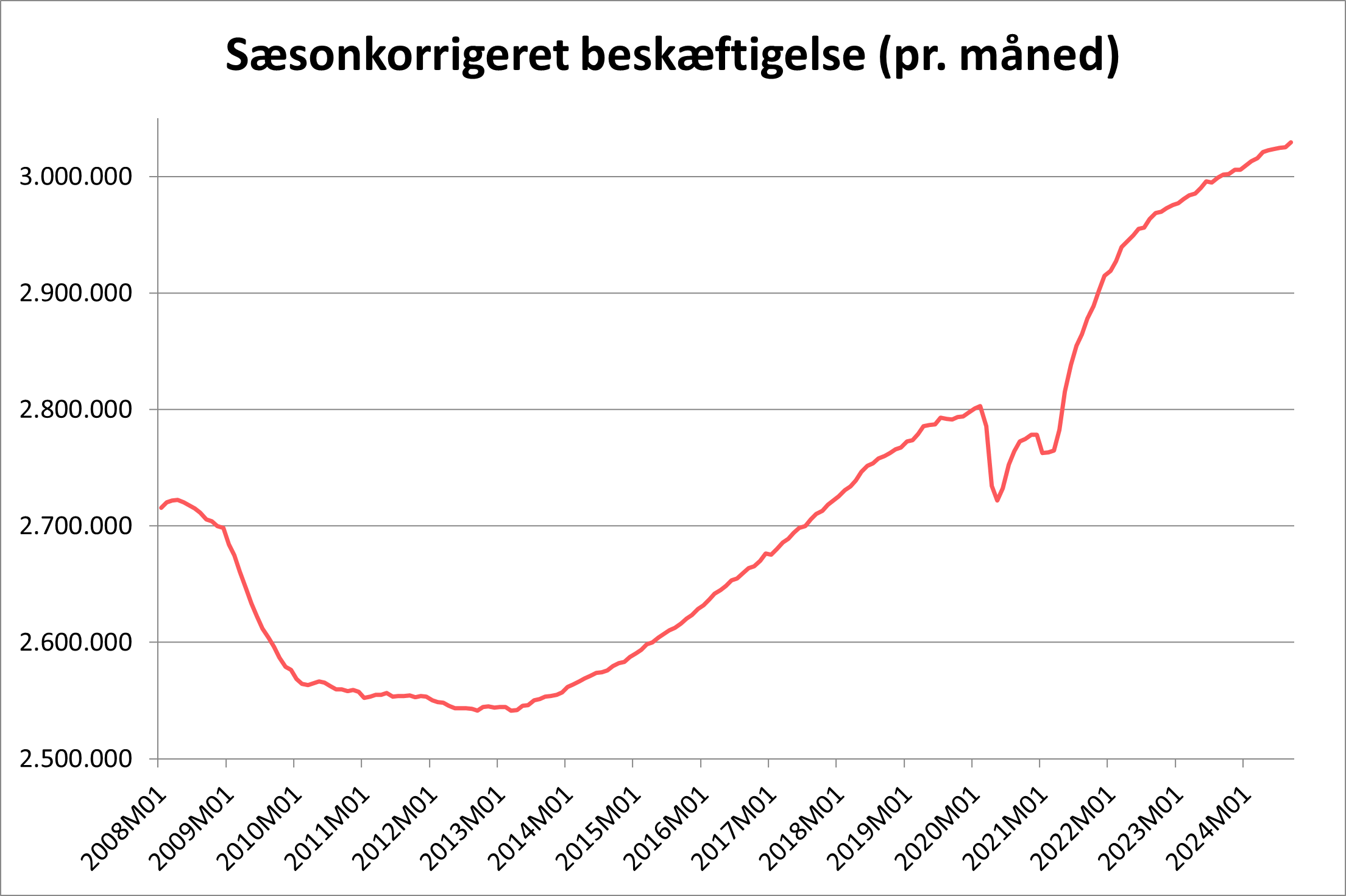 Antallet af beskæftigede er over 226.000 personer højere, end lige før den første corona-nedlukning i marts 2020, og knap 490.000 personer højere end i 2013, hvor bunden blev nået efter Finanskrisen.