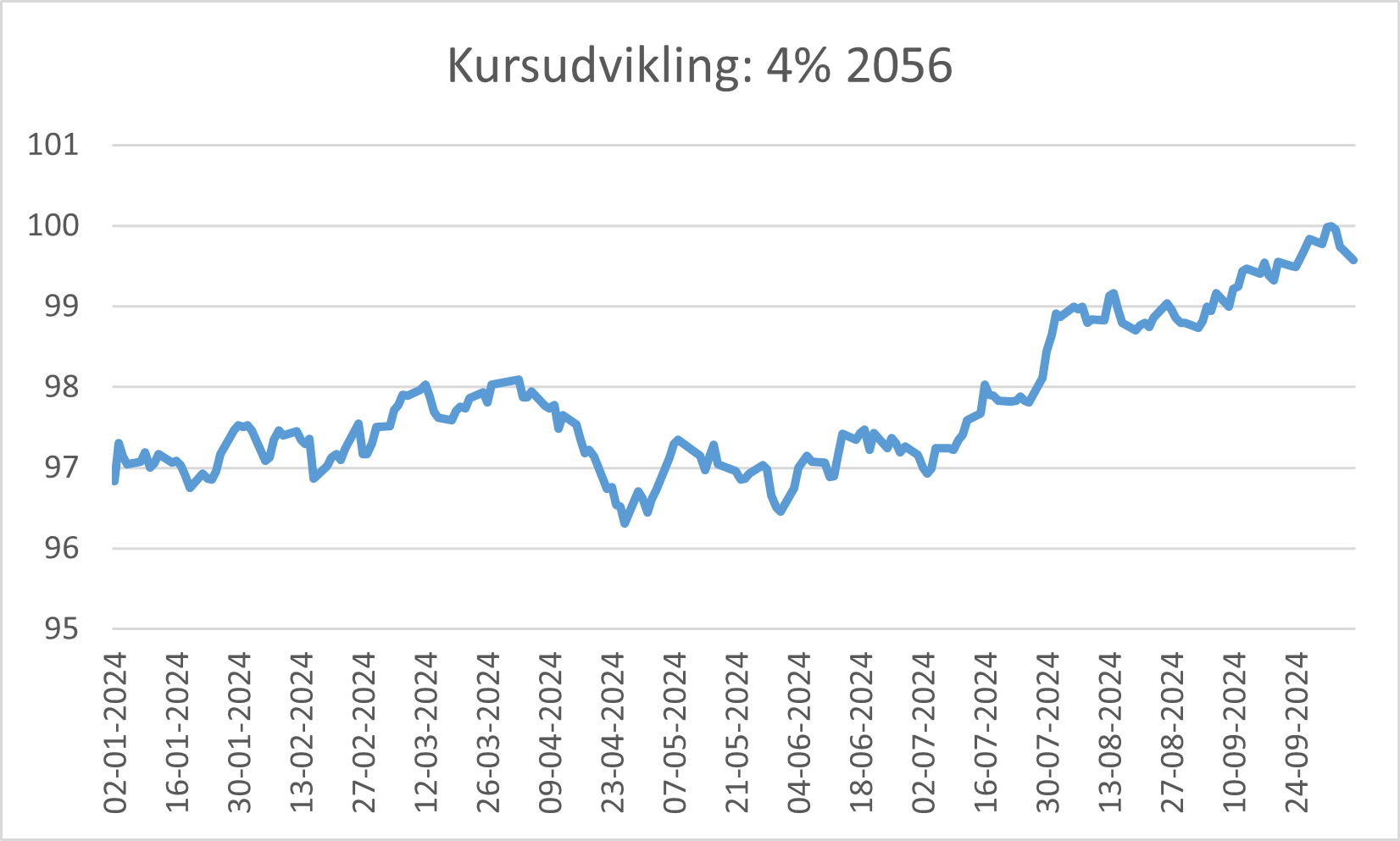 Lån udstedes lige nu i 4% 2056-serien, og vi er tæt på kurs 100. Kurserne steg med godt 1 kurspoint i september måned. Hvis udviklingen fortsætter, kan serien hurtigt lukke for udstedelse af lånetilbud. – Det er dog langt fra sikkert, at de kraftige kursstigninger fortsætter. Store dele af de forventede rentefald i den korte rente er allerede indregnet i de lange renter.